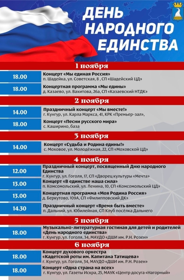 В городе Кунгур и на территории Кунгурского муниципального округа пройдут праздничные мероприятия, посвященные Дню народного единства.