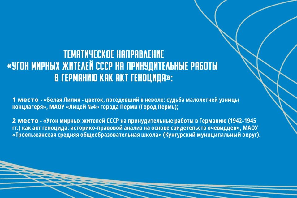 🥈 2 место: Сысоев Максим Андреевич, обучающийся 9 класса Троельжанская школа с проектом «Угон мирных жителей СССР на принудительные работы в Германию (1942-1945 гг.) как акт геноцида: историко-правовой анализ на основе свидетельств очевидцев», руководитель — Комогорова Елена Юрьевна, учитель истории и обществознания.